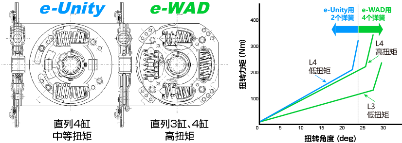 通过减小扭矩限制器部件的尺寸,使得其更容易地被安装在发动机和电机之间。e-WAD 和 e-Unity 扭矩限制减震器,配备了具有高减震性能的减震器,可提高解决 NV 问题的兼容性。